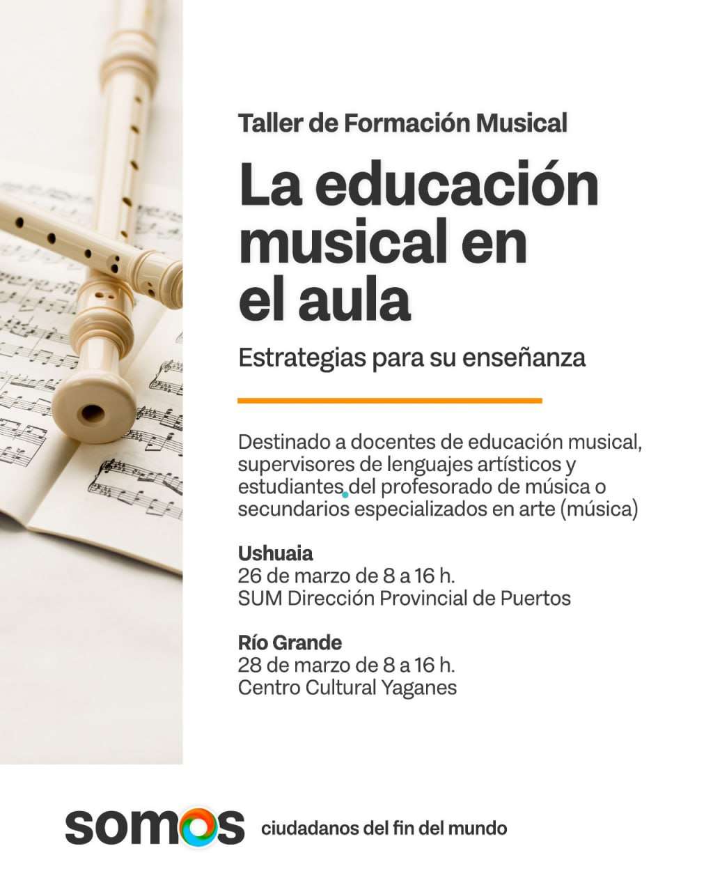 El Ministerio de Educación de Tierra del Fuego, a través de la Dirección Provincial de Educación Artística, invita a docentes de educación musical, supervisores de lenguajes artísticos y estudiantes de profesorado a participar del taller “La Educación Musical en el Aula: estrategias para su enseñanza”.
