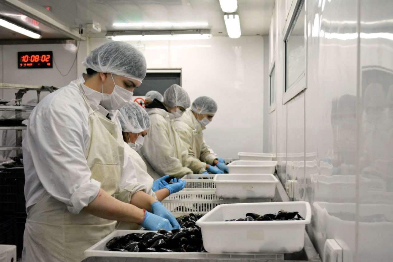 La ministra de Producción y Ambiente, Karina Fernández, junto al subsecretario de Coordinación Pesquera y Acuícola, Diego Marzioni, y el asesor del CFI, Guillermo Abdala, recorrieron la planta donde se procesan mejillones y crustáceos, destacando el impacto positivo del proyecto.