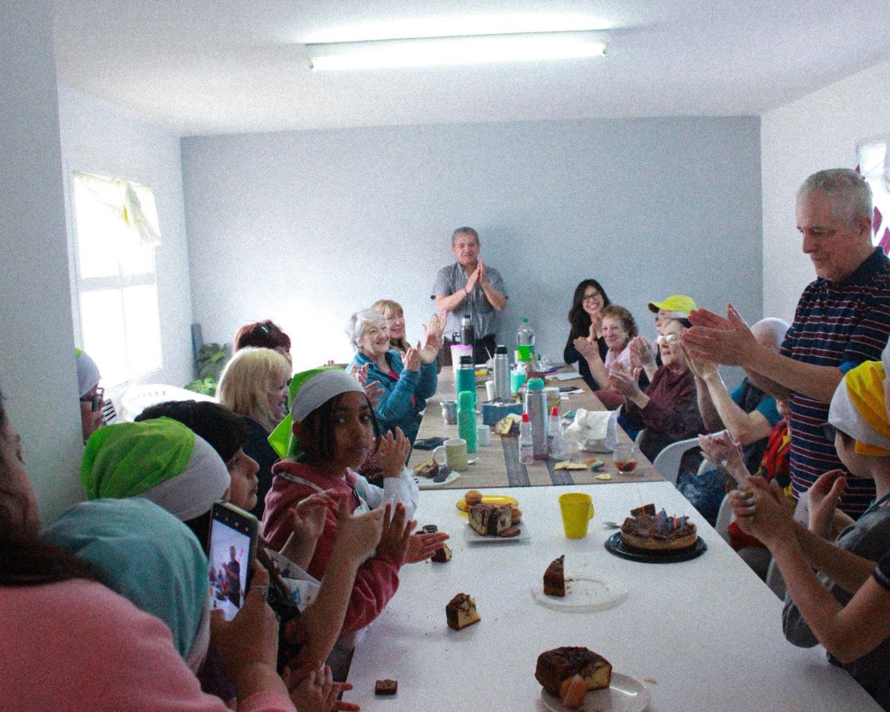 Durante la actividad, que se realiza cada miércoles en la sede Pequeños Pasos, se celebró el cumpleaños número 81 de Adolfo Pérez Fuentes, antiguo poblador de Ushuaia, quien recordó su vida en la ciudad en tiempos pasados.