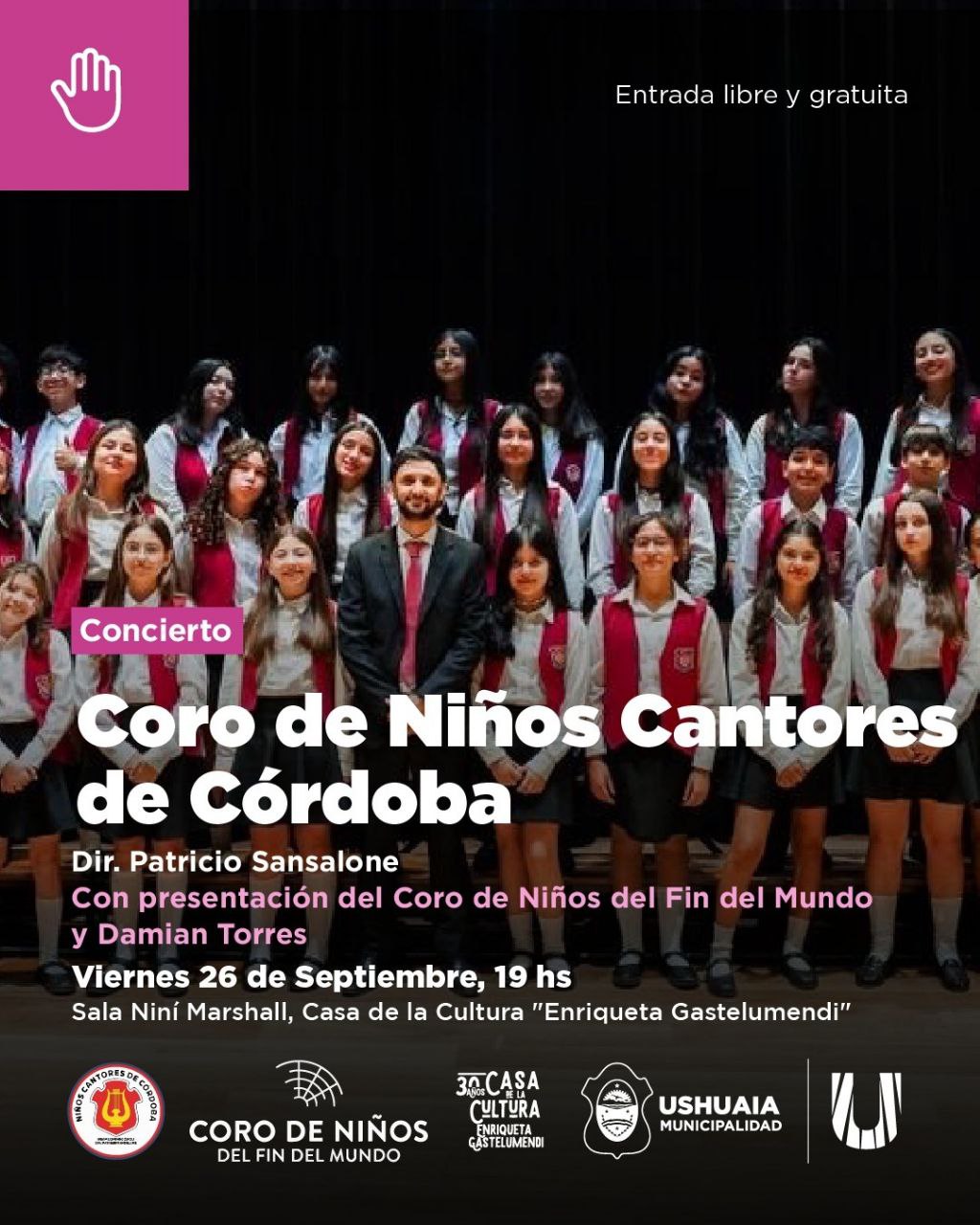 La Municipalidad de Ushuaia, a través de la Secretaría de Cultura y Educación, acompañará el Concierto del Coro de Niños Cantores de Córdoba este viernes 26 de septiembre a las 19:00 horas en la Sala Niní Marshall de la Casa de la Cultura Enriqueta Gastelumendi.