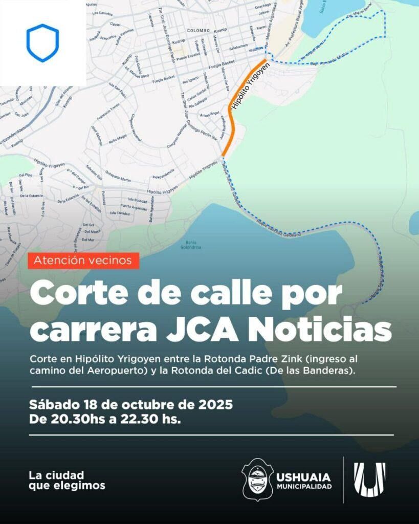 La Municipalidad de Ushuaia informó que el sábado 18 de octubre habrá un corte temporal de tránsito en la avenida Hipólito Yrigoyen por la carrera nocturna “JCA Noticias”. El cierre será entre las 20:30 y las 22:30 horas. La Municipalidad de Ushuaia informó que este sábado 18 de octubre se realizará un corte parcial de […]