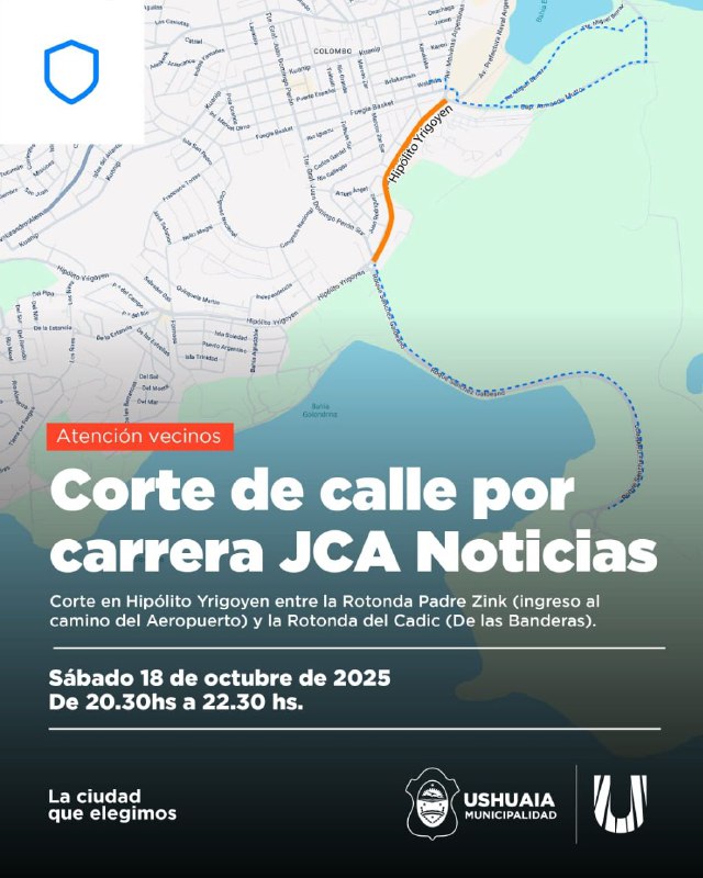 USHUAIA. – La Municipalidad de Ushuaia informó que este sábado 18 de octubre se realizará un corte parcial de tránsito con motivo de la realización de la carrera nocturna “JCA Noticias”.