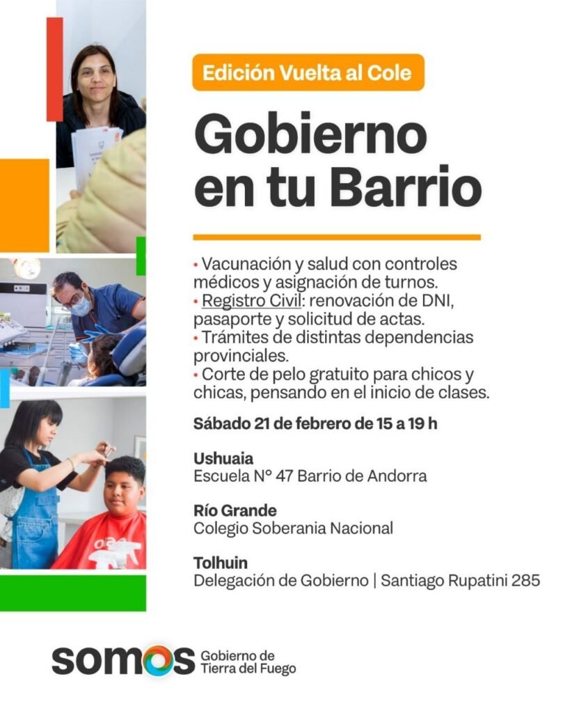 El Gobierno provincial realizará este sábado una nueva jornada de “Gobierno en Tu Barrio” en Tolhuin, Río Grande y Ushuaia. Habrá trámites, vacunación, asesoramiento social y corte de cabello gratuito para niñas y niños. El Gobierno de la provincia realizará este sábado una nueva edición del programa “Gobierno en Tu Barrio”, en formato especial “Vuelta […]