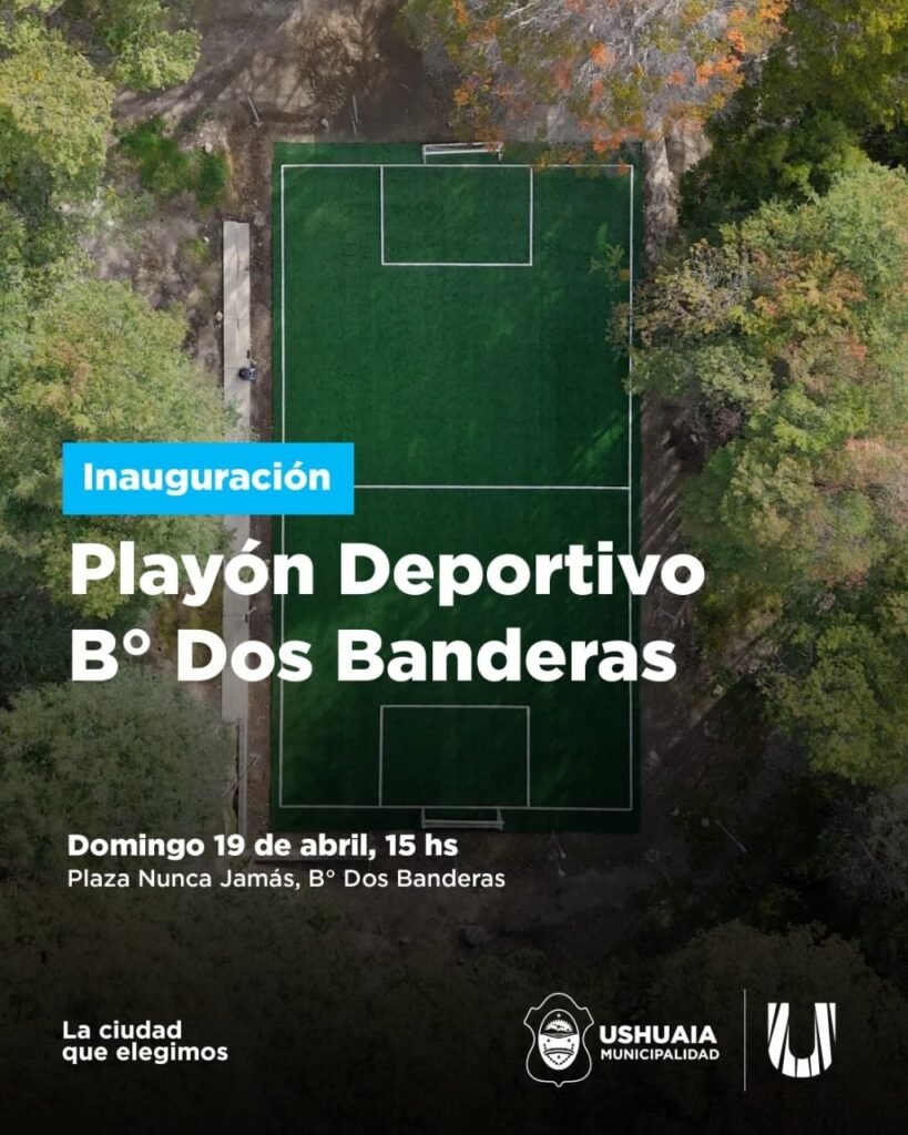El nuevo espacio se habilitará este domingo en la Plaza Nunca Jamás. La inversión fue mayormente con fondos municipales y forma parte de un plan integral de infraestructura urbana. La Municipalidad de Ushuaia inaugurará este domingo 19 de abril el nuevo playón deportivo del barrio Dos Banderas, una obra orientada a fortalecer el acceso al […]