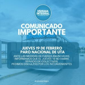 Ushuaia Paro de colectivos en Ushuaia el jueves 19: UISE adhiere a la medida nacional y no habrá servicio 18 febrero, 2026