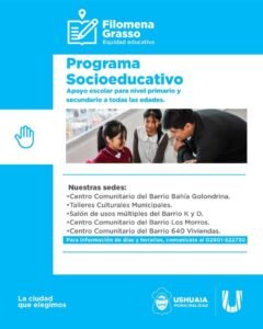 Ushuaia Apoyo escolar gratuito en Ushuaia: abren inscripciones al programa “Filomena Grasso” 9 abril, 2026