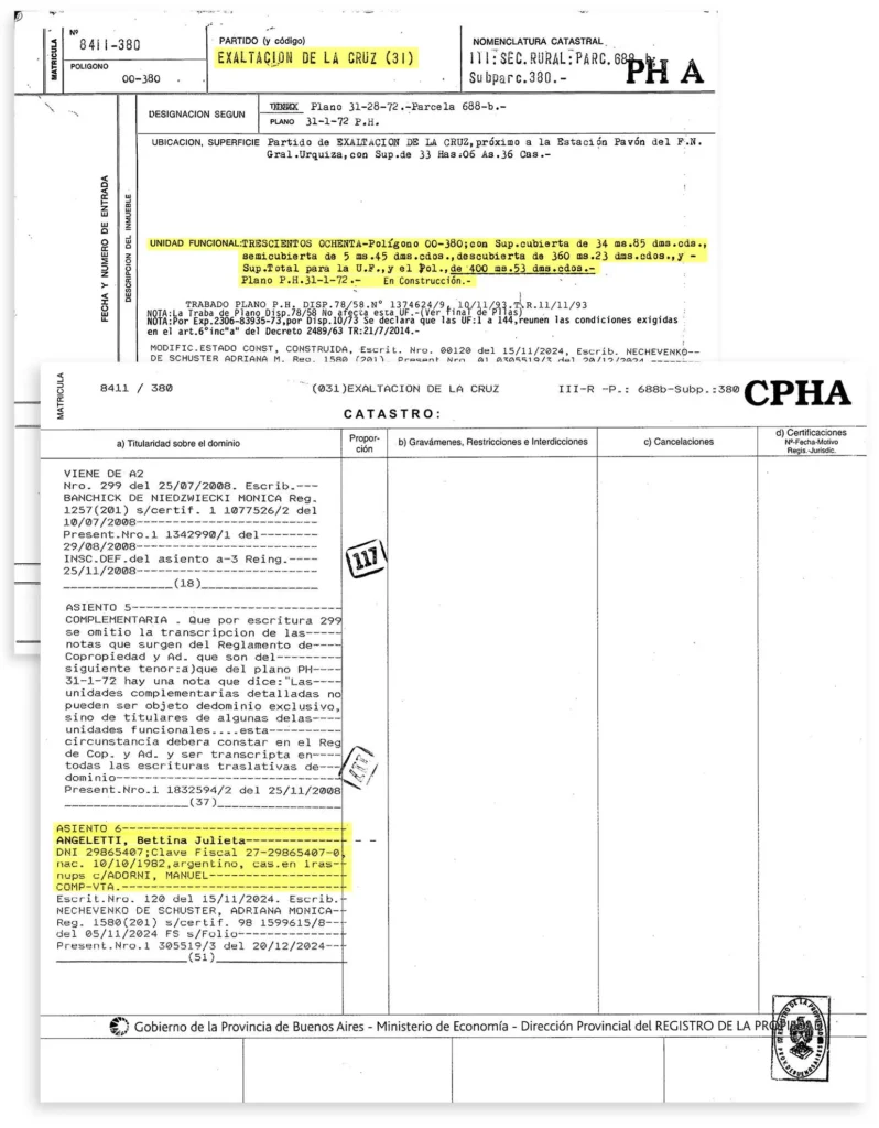 Angeletti figura como única titular de la Unidad Funcional 380 desde el 15 de noviembre de 2024, cuando se la compró a otro particular. El documento deja constancia expresa de su fecha de nacimiento, su nacionalidad y de que está casada con Manuel Adorni .