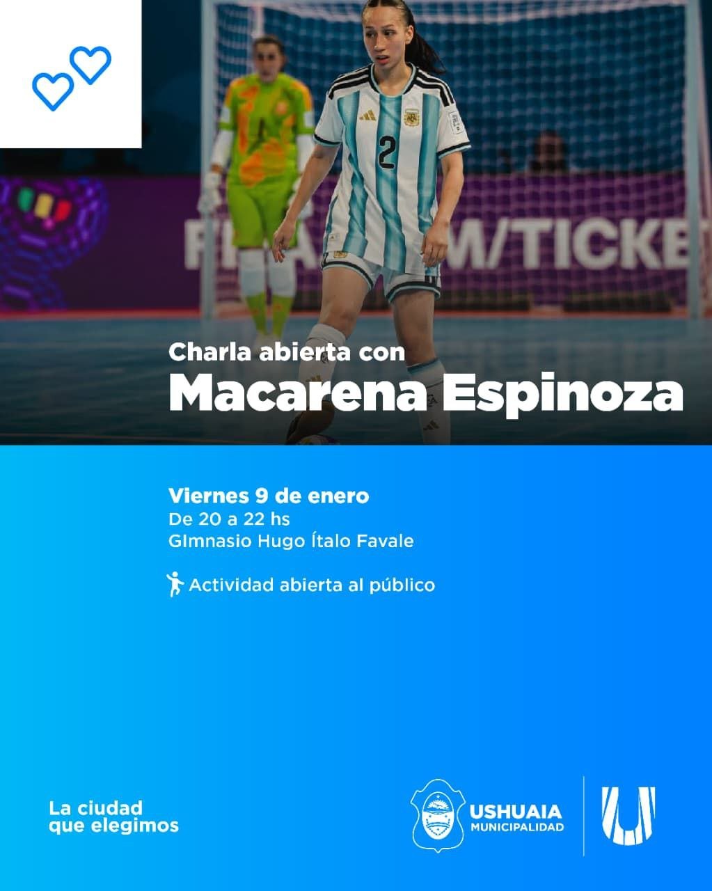 Carla Petrina, vicepresidenta del IMD, destacó la importancia del encuentro: “Ésta será una linda experiencia para todas las jugadoras que se están iniciando en el futsal, y para quienes tienen a Macarena como referente. Es un momento clave para poder verla y escucharla, para hacerles saber al resto de los fueguinos que se puede llegar”.