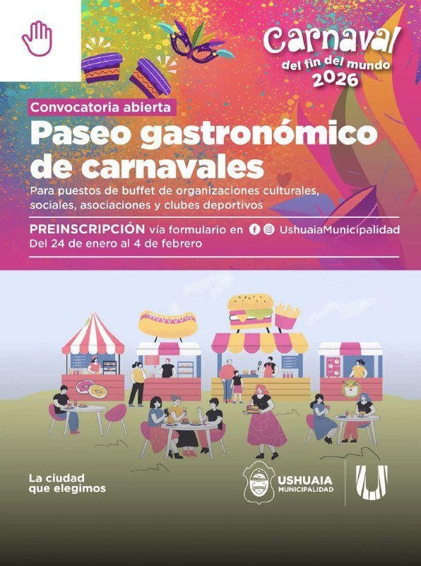 Municipalidad de Ushuaia convoca a organizaciones sociales, culturales y deportivas. Plazo desde el 24 de enero al 4 de febrero. Formulario online disponible. Ushuaia lanza convocatoria para el Paseo Gastronómico del Carnaval 2026 USHUAIA, 24 de enero – La Municipalidad de Ushuaia, a través de la Secretaría de Cultura y Educación, abrió la convocatoria de preinscripciones […]