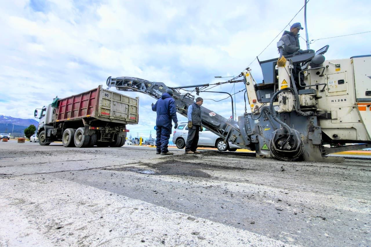 Entre las tareas en ejecución, se destacan los trabajos de bacheo en el barrio Bahía Golondrina y en sectores de la avenida Hipólito Yrigoyen. Además, en la zona céntrica se inició el proceso de recuperación vial con tareas de fresado en la avenida Maipú y en la calle Yaganes.