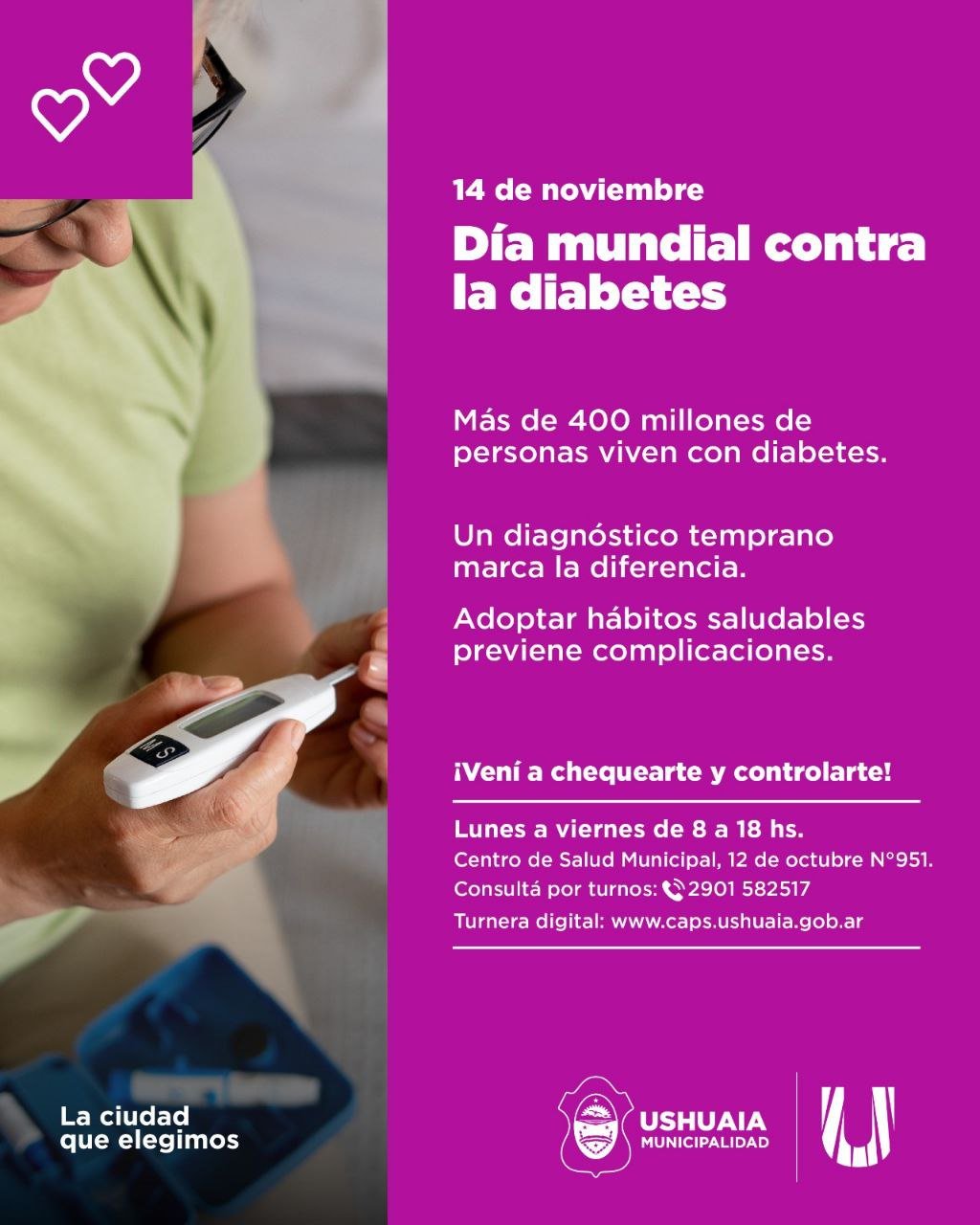 En el marco del Día Mundial contra la Diabetes, la Municipalidad de Ushuaia, a través de la Secretaría de Políticas Sociales, Sanitarias y Derechos Humanos, invita a toda la comunidad a realizar controles preventivos y consultas médicas gratuitas en el Centro de Salud Municipal, ubicado en 12 de Octubre N°951.